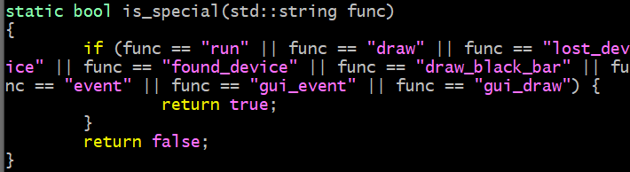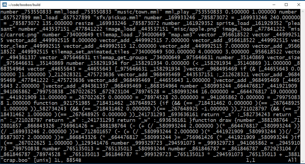 EDIT5: I was wrong! There’s no way to fix this dependence on a list of reserved names. Not without forcing you to recompile BooBoo when you obfuscate. Like I said, it’s minor anyway but since the obfuscated code is written before and in a separate execution from launching it, those names like “draw” and “run” need to remain the same because there’s no way to get the real name from a obfuscated name… you could manually edit all those into game_launcher.cpp with each obfuscation… that’s the only other way to do it than a list of special names.